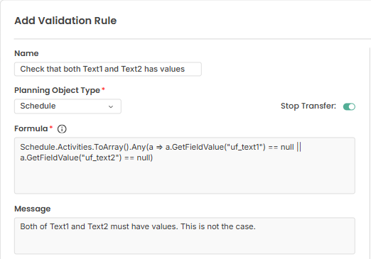 Schedule.Activities.ToArray().Any(a => a.GetFieldValue("uf_text1") == null || a.GetFieldValue("uf_text2") == null)Screenshot where this is implemented: