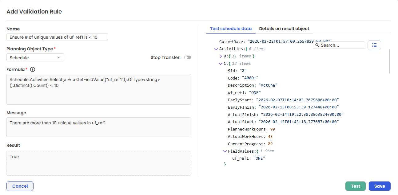 Schedule.Activities.Select(a => a.GetFieldValue("uf_ref1")).OfType<string>().Distinct().Count() < 10Here is the screenshot from the UX: