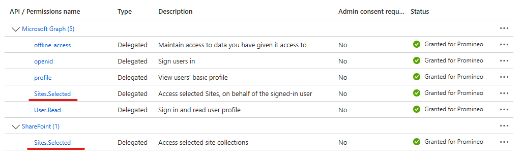- 2. Assign the Sites.Selected Permission for both Microsoft Graph and SharePoint.