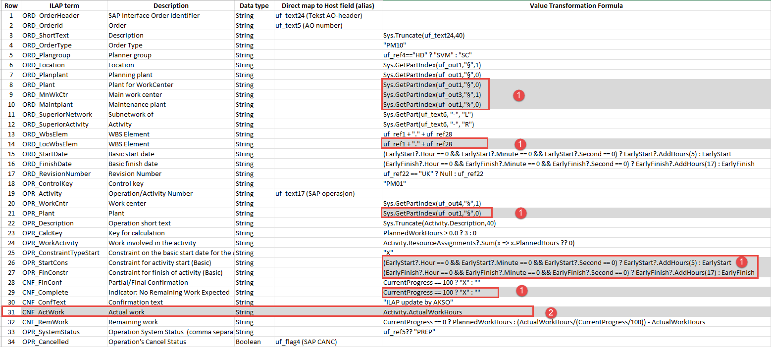 | 32 | CNF_RemWork | Remaining work | String | CurrentProgress == 0 ? PlannedWorkHours : (ActualWorkHours/(CurrentProgress/100)) - ActualWorkHours | |