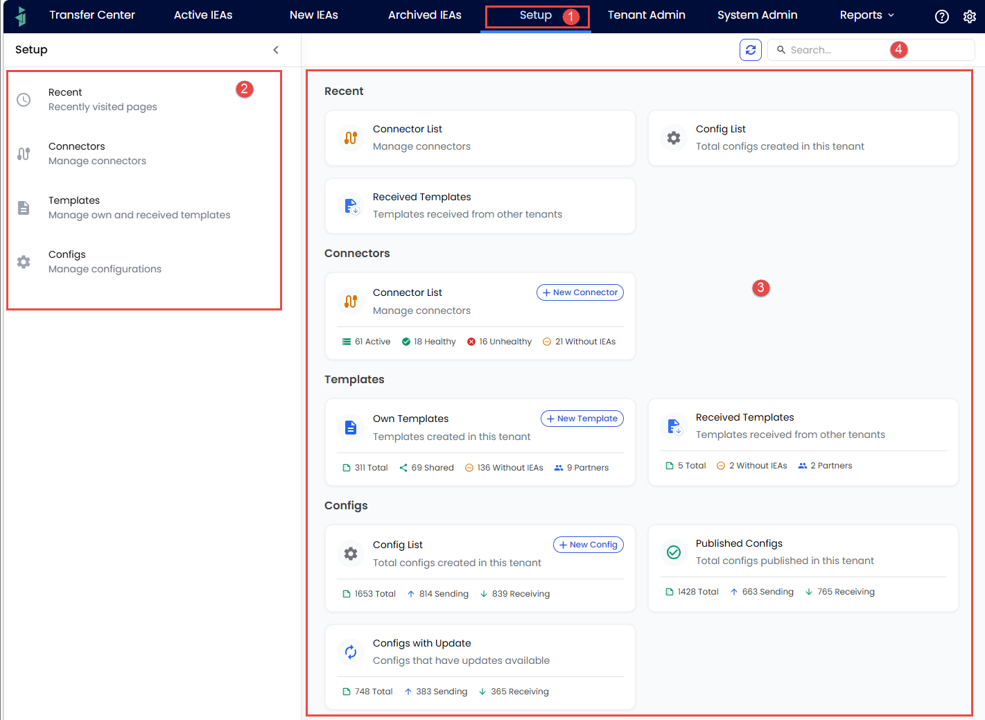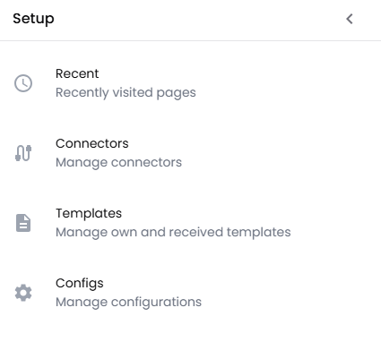 The Setup Admin has access to a "portal page" where all the prerequisite settings can be made before creating IEAs: Connectors, Templates and Configs can be set up and modified: