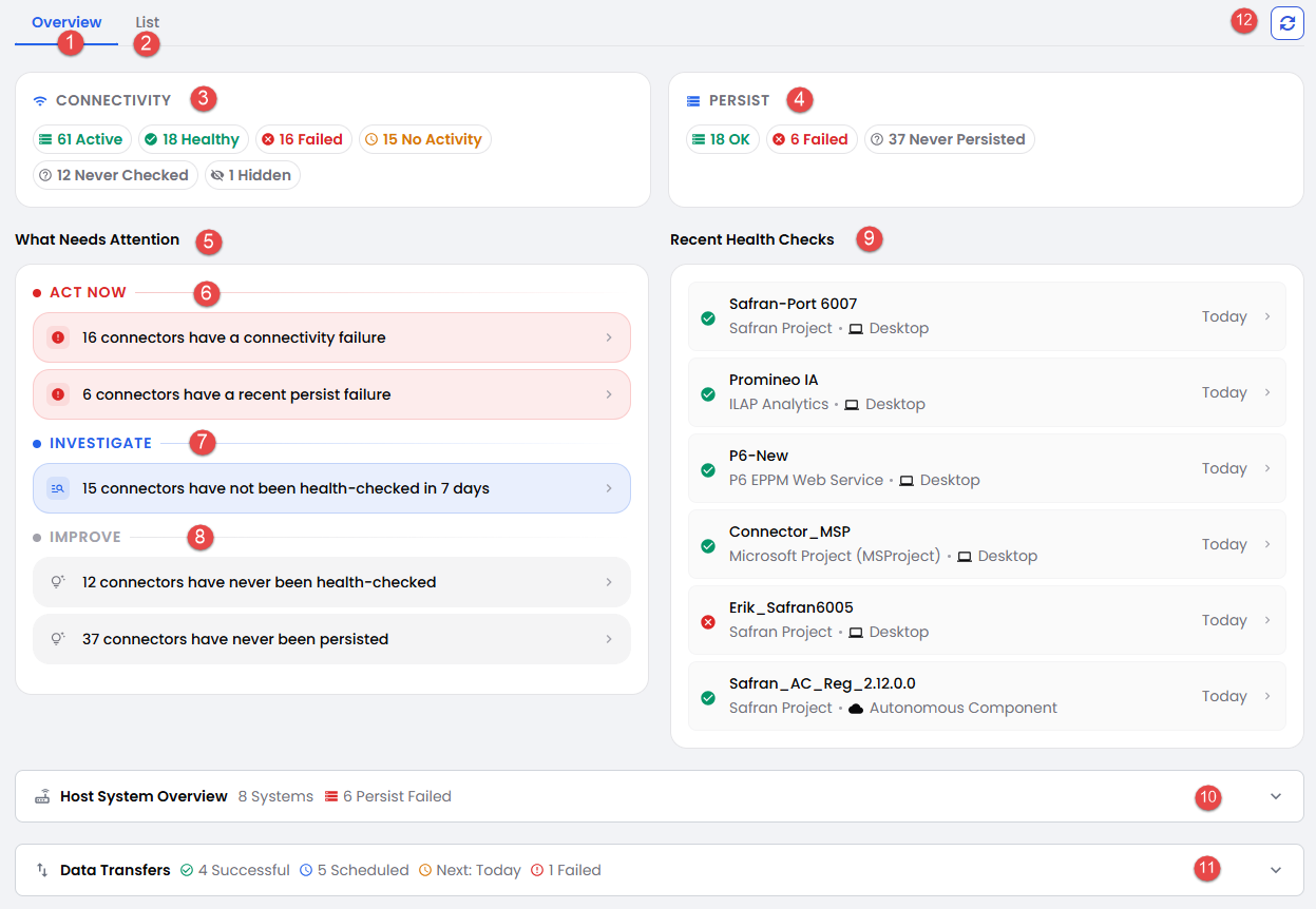 - "Act Now" shows shortcut(s) to filtered list of connectors with specific problems