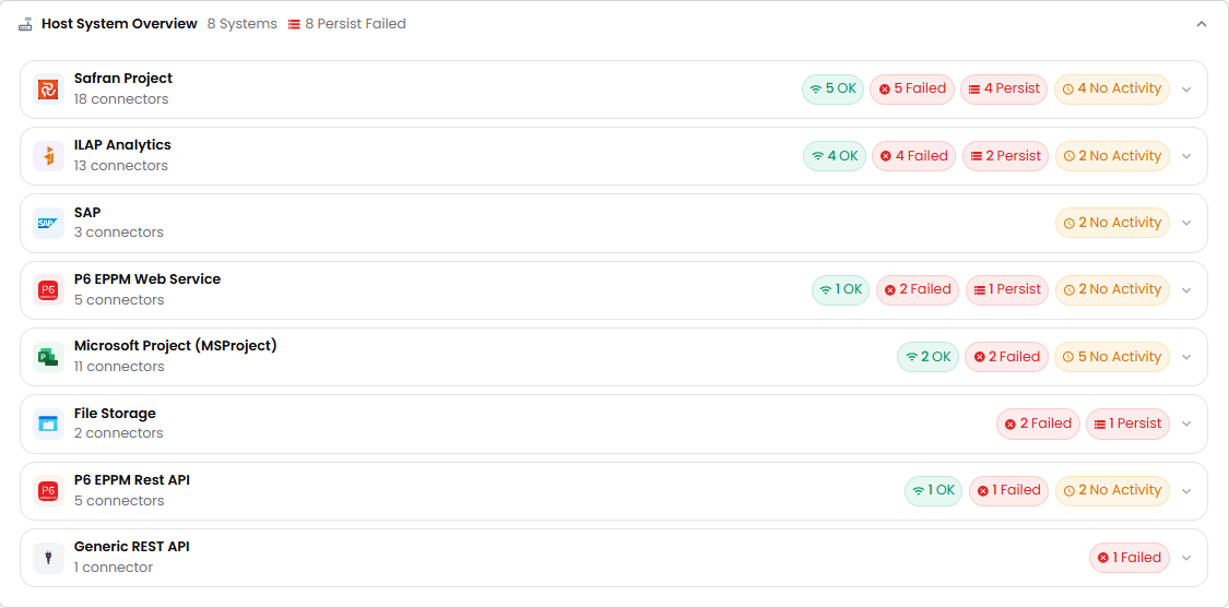 The Connector status based on Host System. Each Host System has a set of numbers at right that act as a shortcut for filtering Connectors.