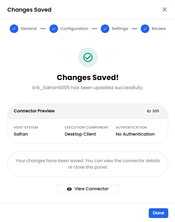 Press "Create Connector"-button to save connector and move to Step 4 (Review Saved Connector):