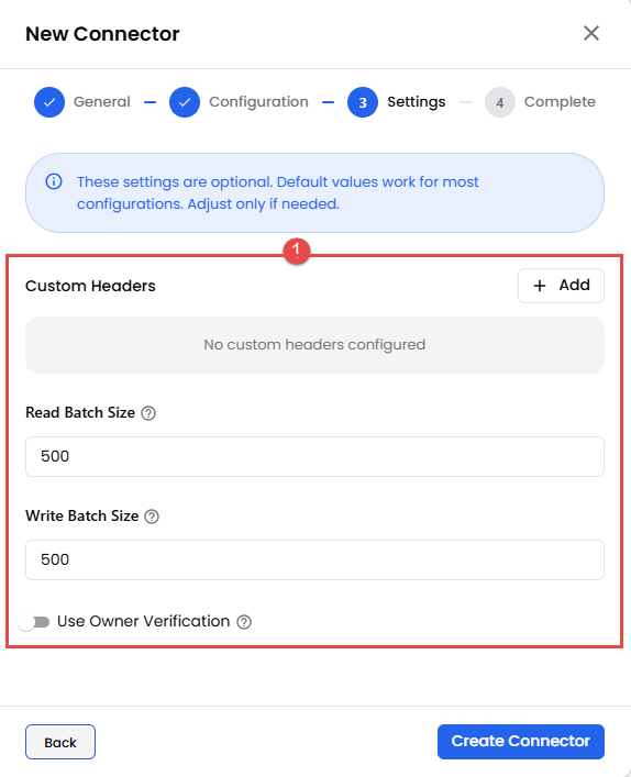 The only difference between editing a connector vs. creating one is that the header text "New Connector" is replaced with "Edit Connector" (see screenshot above).Step 2: Configuration