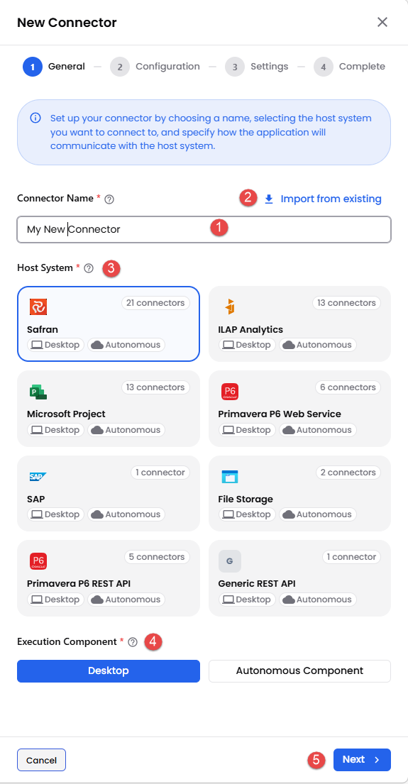 Here you will need to give the connector a name (1), select which Host System it should be used for (3) and which Execution Component (4) it should use. You can also copy settings from other existing connectors (2). Then press "Next" (5) to continue to the next step:
