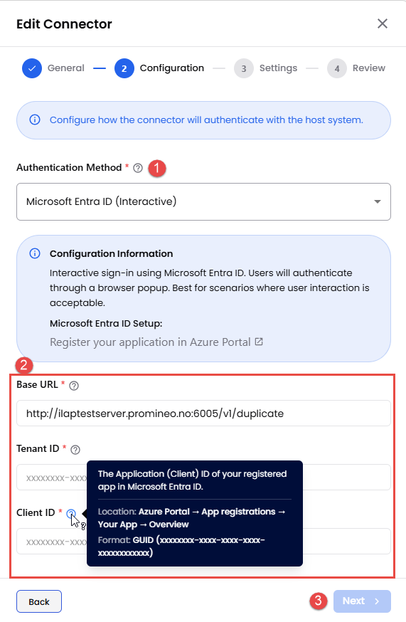 Depending on the choice of Host System in Step 1, you will se a list of available Authentication Methods (1) and depending on the choice, the UX at (2) will change. Again - please read the information icons to gain insight into what each setting means.
