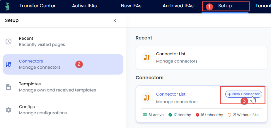 The entry point for launching the wizard is the Setup Form's (only available to Setup Admins) "+New Connector"-button: